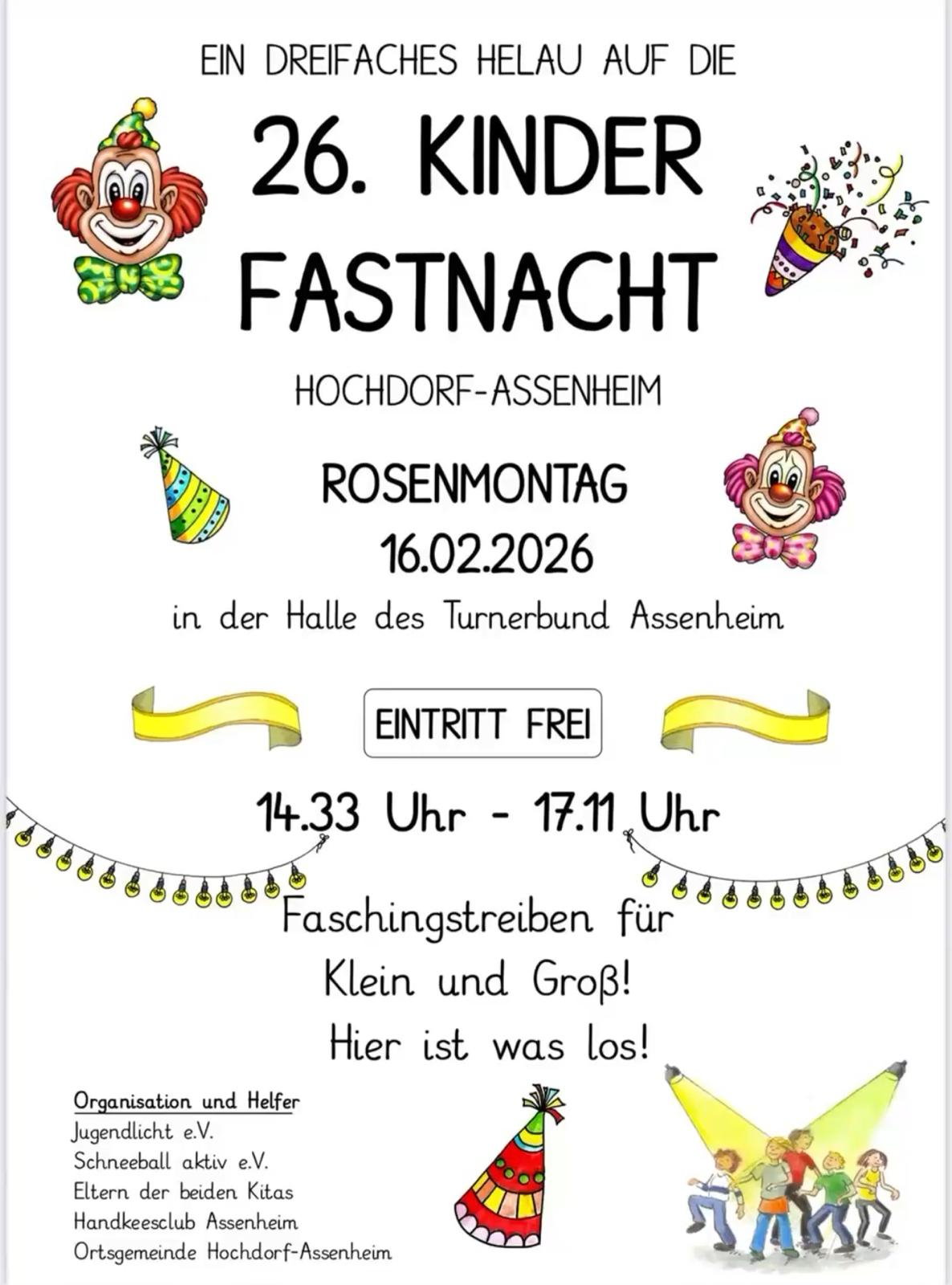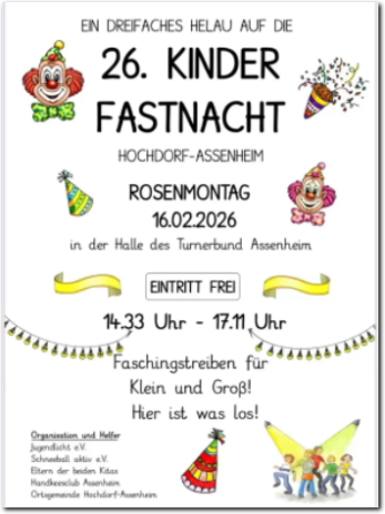 Am Rosenmontag wird es bunt in Hochdorf-Assenheim! Wir laden alle kleinen und großen Narren herzlich zur 26. Kinderfastnacht ein.