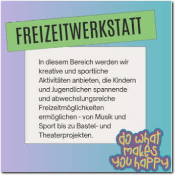 Die Freizeitwerkstatt ist der bunte und lebendige Treffpunkt für alle, die Spaß an kreativen, sportlichen oder kulturellen Aktivitäten haben.