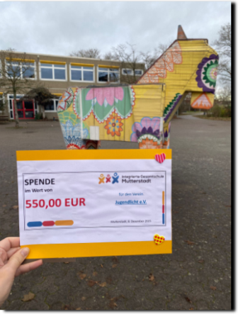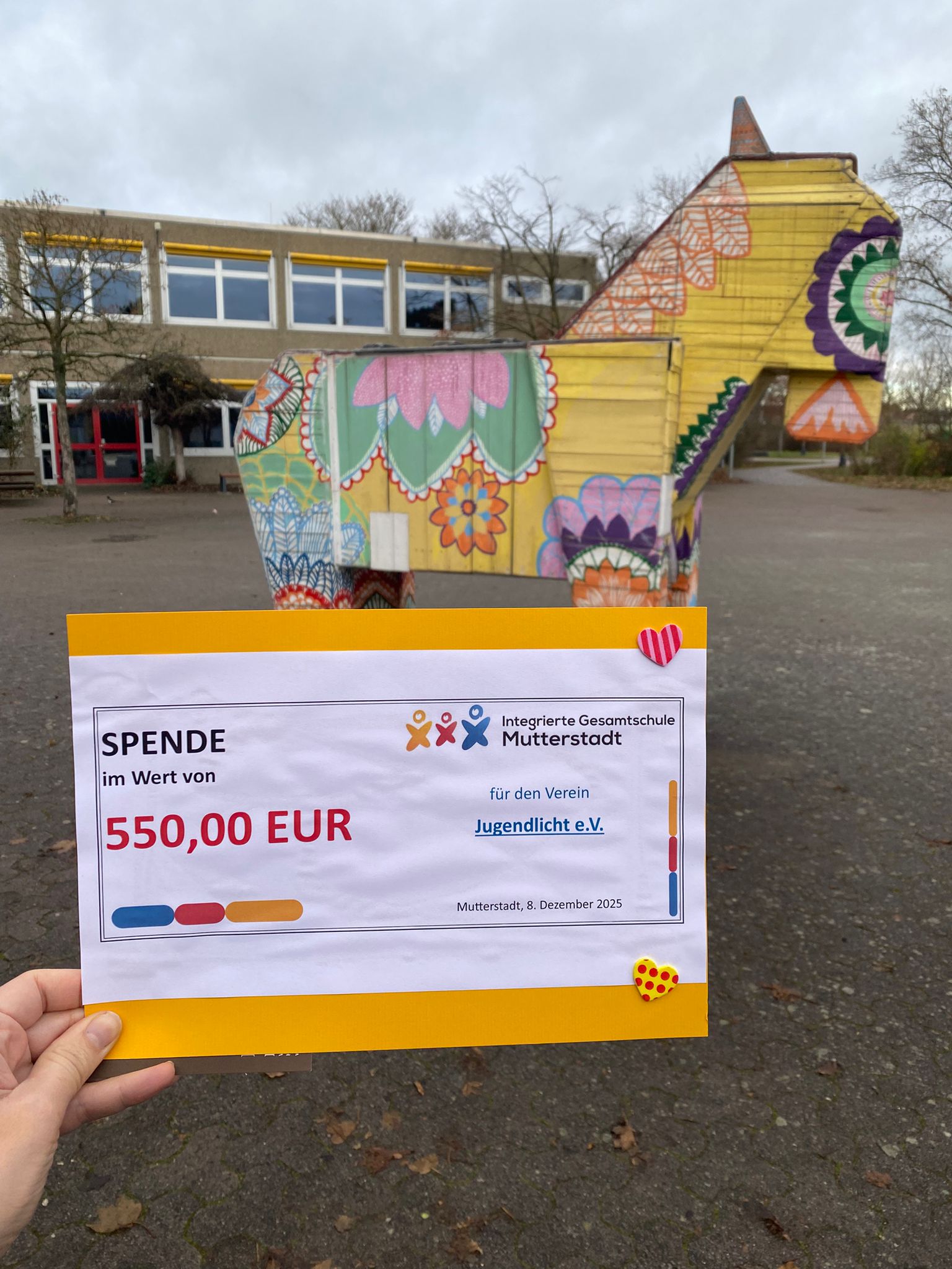 Wir werden „Jugendlicht e.V.“ 550,00 EUR spenden. Deshalb laden wir Sie ganz herzlich zu einer kleinen Feierstunde ein, in der wir allen Spendenempfängern der diesjährigen Aktion einen symbolischen Scheck überreichen möchten.